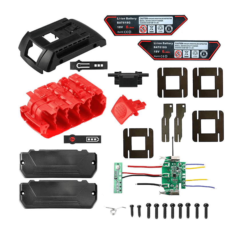 Replacement spare parts for Bosch BAT618 BAT 618G 6.0AH 18V Battery Pack, including outer battery box shell, BMS, battery holder, nickel strip, power indicator board, and screws.