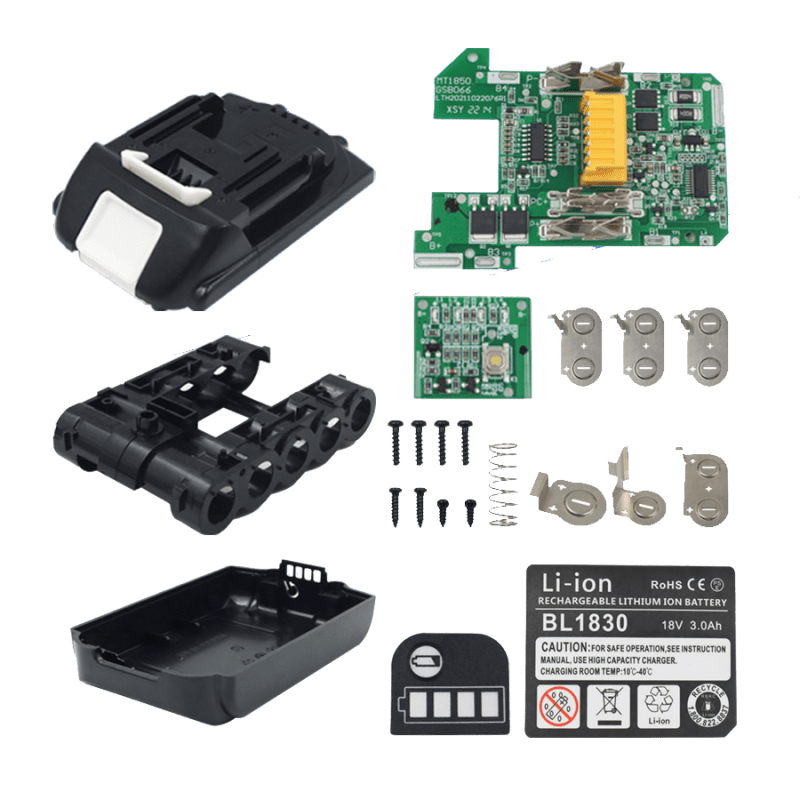 Replacement spare parts for Makita 18V Battery Pack, including outer battery box shell, BMS, battery holder, nickel strip, power indicator board, and screws.